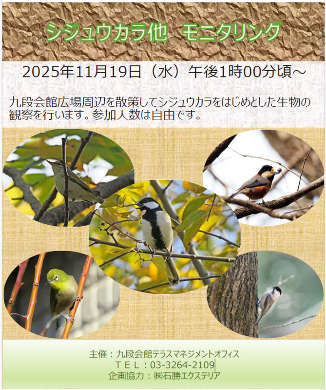 九段会館広場周辺を散策してシジュウカラをはじめとした生物の観察を⾏います。参加人数は自由です。「生物の観察」と「落ち葉堆肥の作成」も行う予定です。11月19日(水)13:00~